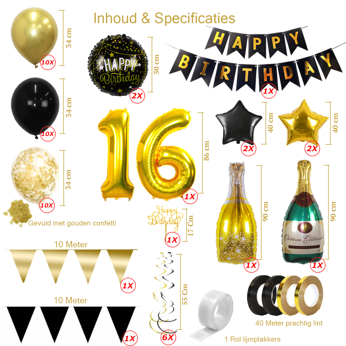 BallonnenpakkettenHappy Birthday BallonnenAccessoiresBeschrijving16 Jaar Zwart Goud Versiering Slingers Pakket